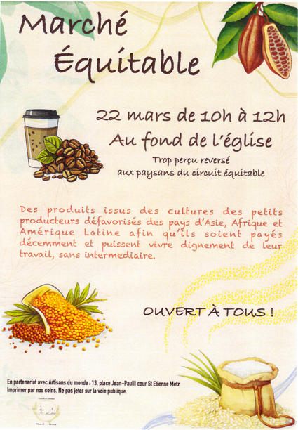 Dimanche 22 mars 2026, se tiendra la nouvelle édition du Marché Équitable initié par le Conseil de Fabrique d’Ottonville. Venez nombreux soutenir les petits producteurs défavorisés des pays d’Asie, d’Afrique et d’Amérique Latine.